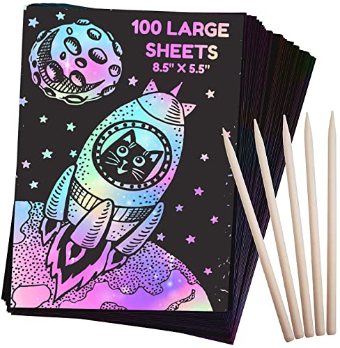- 100 Sheets to Create Larger Than Life Doodles – Our half letter sized scratch off cards are the perfect canvas for budding artists. They come in a pack of 100 sheets in a cute box so you’ll always have some on hand when inspiration strikes.