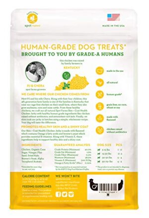Details: At Spot Farms, our dogs are our family. That’s why we use a farm-to-fork approach for all natural dog treats and chews. Partnering with farm families across the U.S., we source the very best regionally grown, antibiotic-free chicken as the main ingredient for our Chicken Jerky Skin + Coat treats. We leave out fillers like corn, wheat, or soy, and our treats are chock-full of things dogs love like real meat, flax seed, and dried kale. From the ingredients they’re made with to the kitchens they’re made in, our treats meet strict USDA standards. Derived from simple, honest recipes and carefully cooked in small batches, all Spot Farms natural dog treats are created in USDA kitchens using wholesome, human-grade ingredients. That means that unlike most other dog food manufacturers, we never use feed-grade ingredients—only those graded for human consumption. You won’t find any by-products, artificial colors, preservatives, BHA, BHT, or any other chemical with strange abbreviated names in any of our treats. Only high-quality goodness for the very best dogs. We take a lot of pride in the treats we make and think your dog will taste the difference. Spot Farms functional jerky treats are the ideal dog treats for all good pups in your family who need a little extra skin and coat TLC. Finally, you can feel good about treating your dog. Check out our full line of Spot Farms dog treats including Training Treats, Freeze Dried, and Tenders today!