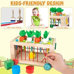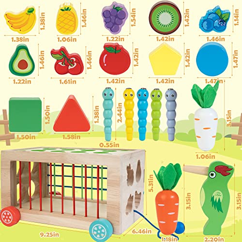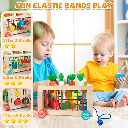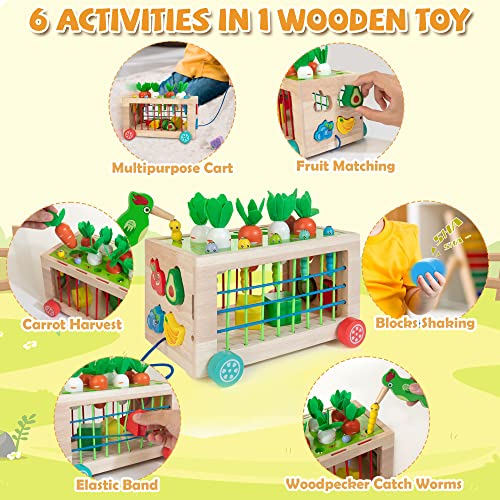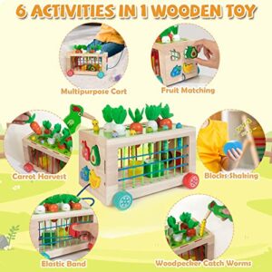 - 【6 in 1 Montessori Toys】This toys for toddlers includes carrot harvest game, fruit shape matching, woodpecker catches worms, elastic bands, clattering blocks, and working cart, 6 games with different difficulty to provide multisensory play for 1 year old and above.